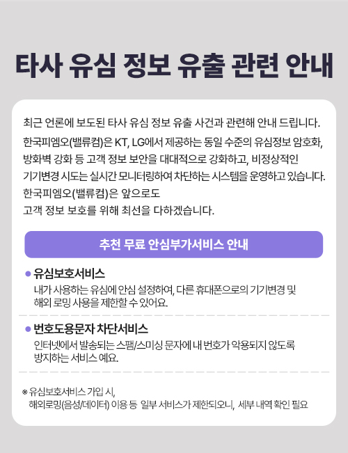 밸류컴 유출 사실을 인지한 즉시, 고객님의 추가 피해 방지 및 보호를 위해 비정상 결제 자동차단 및 본인인증 수단 강화와 함께 지속적인 모니터링을 수행하고 있습니다. 또한, 비정상 소액결제 피해가 확인된 고객님들께는 개별 연락드려 소액결제 청구 면제 등 피해가 발생하지 않도록 조치하고 있습니다.